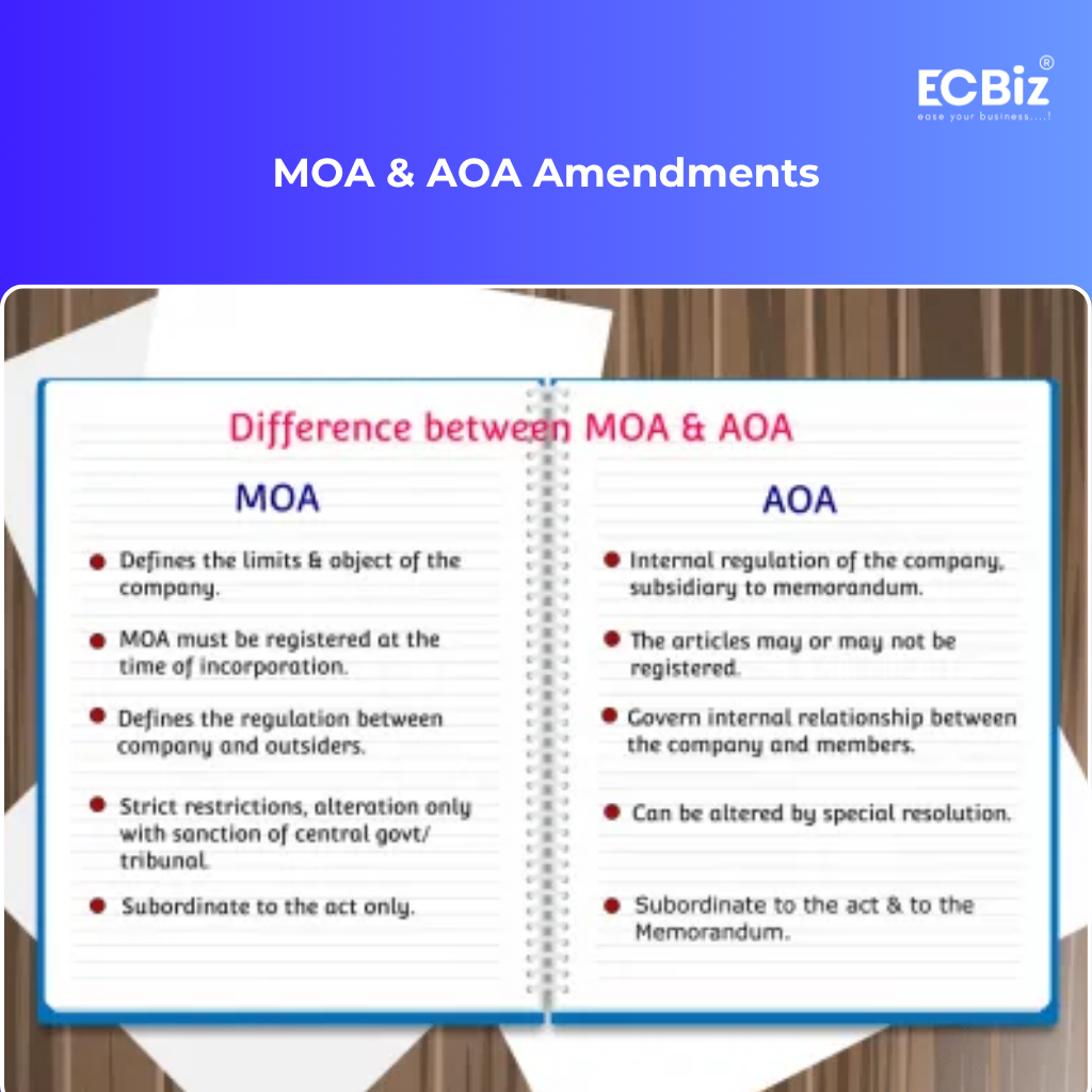 MOA (Memorandum of Association) and AOA (Articles of Association) are foundational documents that define a company’s scope and internal governance. Amendments to these documents may be required due to business expansion, changes in objectives, share capital alterations, or structural updates. We provide end-to-end assistance for modifying MOA and AOA, including drafting resolutions, conducting board or shareholder meetings, and filing necessary forms with the MCA. Our expert support ensures all amendments are legally compliant, accurately documented, and processed without delays.